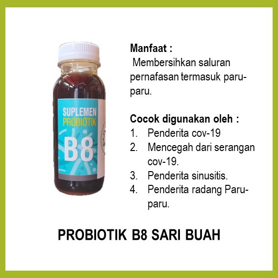 Probiotik Sari Buah jenis B8 ini Hasil fermentasi ekstrak kulit manggis, ekstrak daun sirsat, dan air kelapa. Karya original Prof Sukardi. Mengandung puluha juta bakteri Lactobacillus Accidophylus, Lactobacilus casei dan Lactobacillus Bulgarycus.